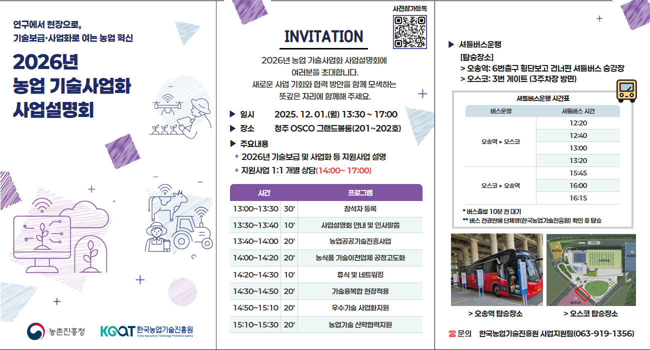 1. 한국농업기술진흥원에서는 대학을 대상으로 농촌진흥청에서 추진하는 ‘농업기술 산학협력지원’ 지원사업의 이해도 제고 및 사업 홍보를 위한 「2026년 농업 기술사업화 사업설명회」를 개최합니다.