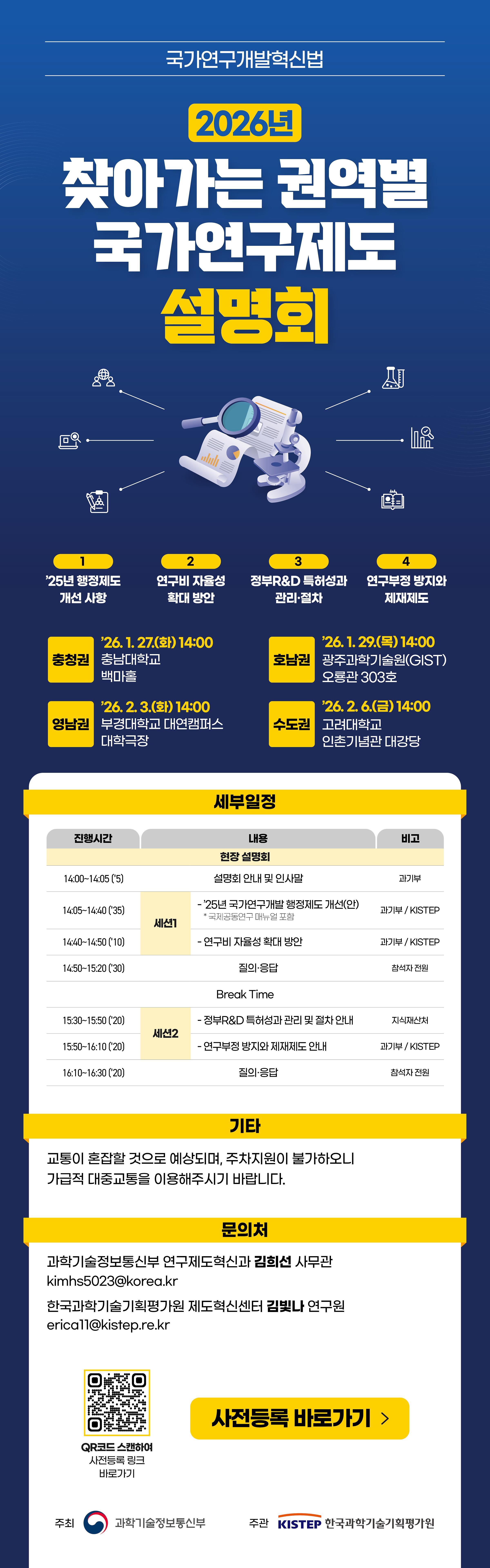 과학기술정보통신부와 한국과학기술기획평가원이 ’25년도 행정제도개선 사항 및 변화된 국가연구제도를 안내하기 위하여 「2026년 찾아가는 권역별 국가연구제도 설명회」를 개최합니다. 많은 관심과 참여 부탁드립니다.