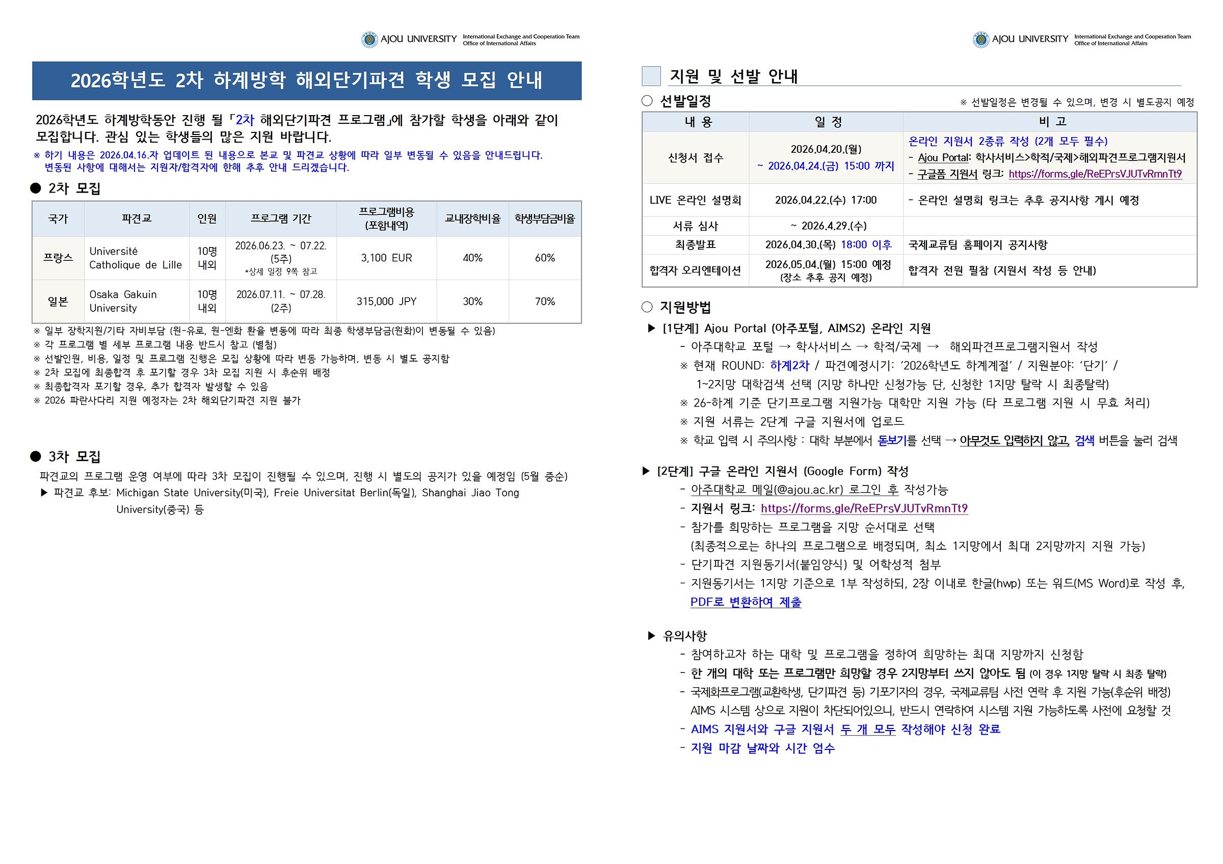▷ 2026.4.20.(월) ~ 2026.4.24.(금) 15:00까지 | 지원서 작성 (★★★아주포털 및 구글폼(지원동기) 꼭 2개 모두 작성!★★★)